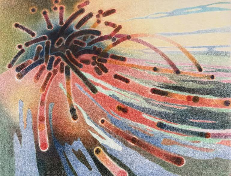 Fields of Light — Radiant Bloom is a dynamic, chromatic drawing where illumination appears to expand outward in an organic, blooming form. Created with nuanced layers of colored pencils, the work pulses with energy while maintaining a balanced, atmospheric harmony. The drawing belongs to Tamar Gior...