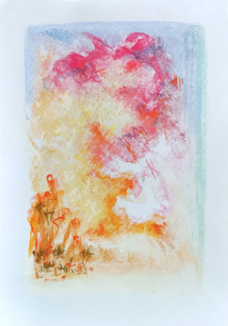 "Radiant Flux" is an evocative abstract drawing created with soft pastel on paper. The piece features a vibrant explosion of warm hues, with reds, pinks, and oranges blending seamlessly into lighter, airy tones. The dynamic application of pastels creates a sense of energy and movement, inviting view...