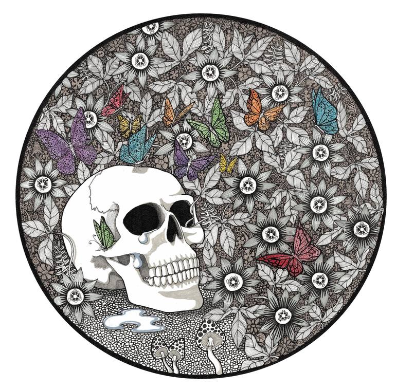 This is a mixed media drawing based on the concept of death of one way and simultaneous rebirth of something new. Not necessarily a literal theory, it could be the death of an idea or way of life, etc. The skull is crying tears of joy to have found this new rebirth, while the passion flowers repre...
