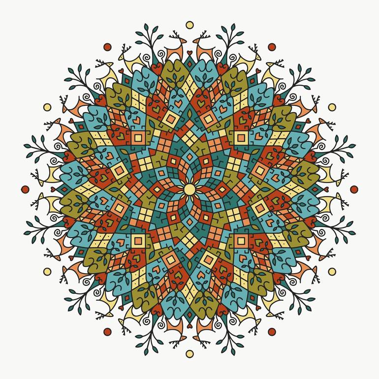 Mandala with geometric ornament, suns and deer. The deer is a symbol associated with the Sun, sunrise, light, purity, renewal, revival, creation and spirituality. Due to the similarity of deer antlers with branches, the image of a deer is combined with the Tree of Life. In addition, deer antlers sym...