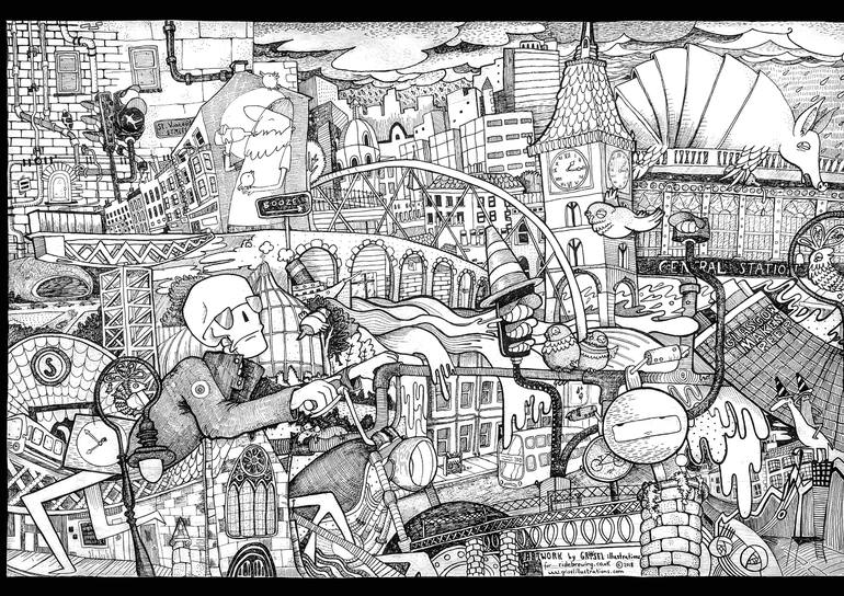 I did this large illustration artwork design for 'Ride brewery' for their beer label, however they never used it in the end. I have the full copyright for my artwork. The illustration consist in various urban scenes of Glasgow city and a skull rider to match the beer label desired character.