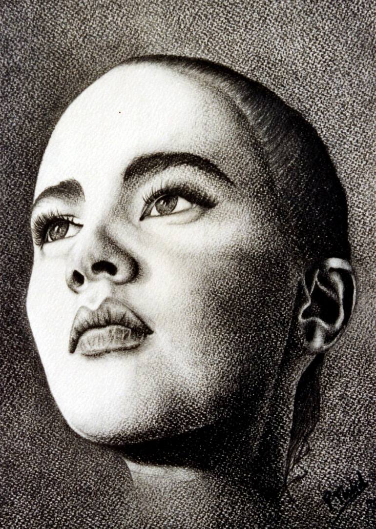 Rendered in soft, nuanced shades of graphite, the portrait captures a woman lost in contemplative reverie. The shadows play gently across her face, accentuating her features with a quiet, timeless allure. Strands of hair frame her face with a delicate texture, each line carefully placed to reflect a...