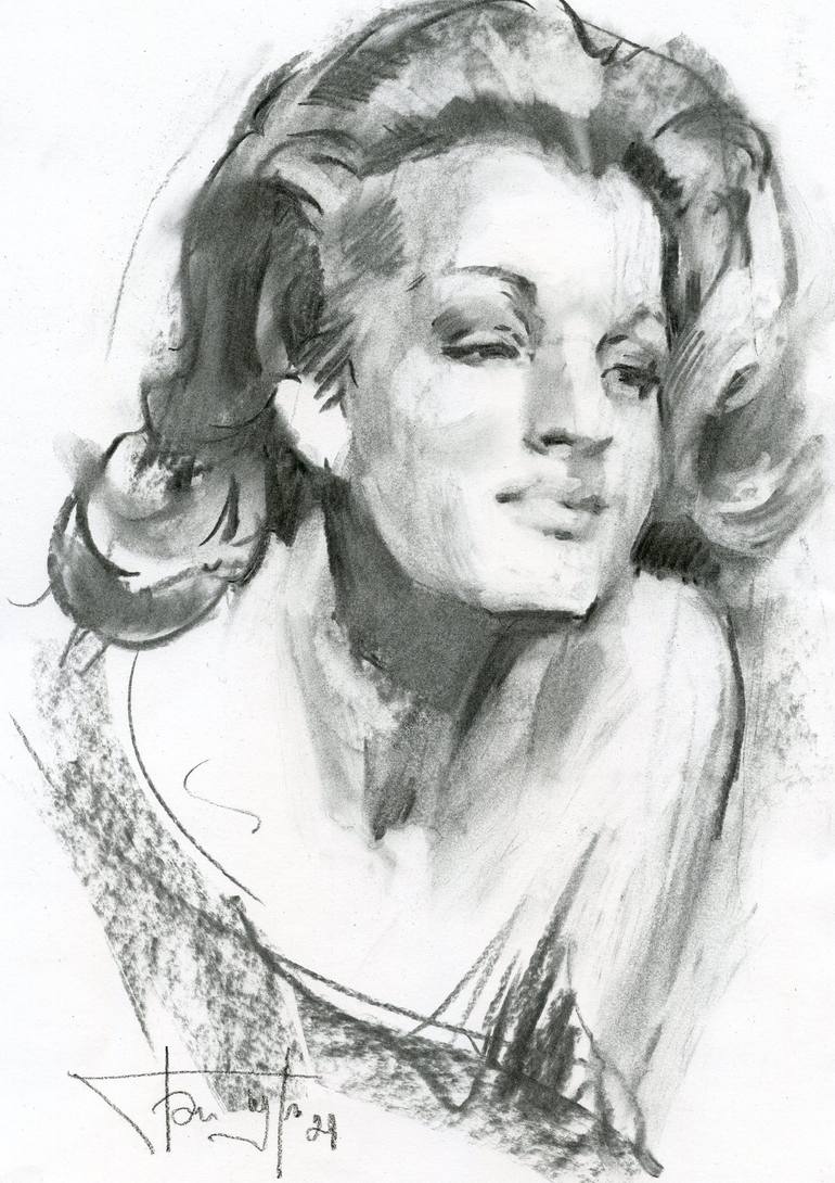 Portrait of Romy Schneider. Delicate, feminine and slim. Her light eyes against the dark skin made her unearthly. But she is earthly, passionate, charming. A woman with an amazing appearance and a difficult fate. I wanted to capture her as happy and feminine as every girl would like to be. A4, paste...