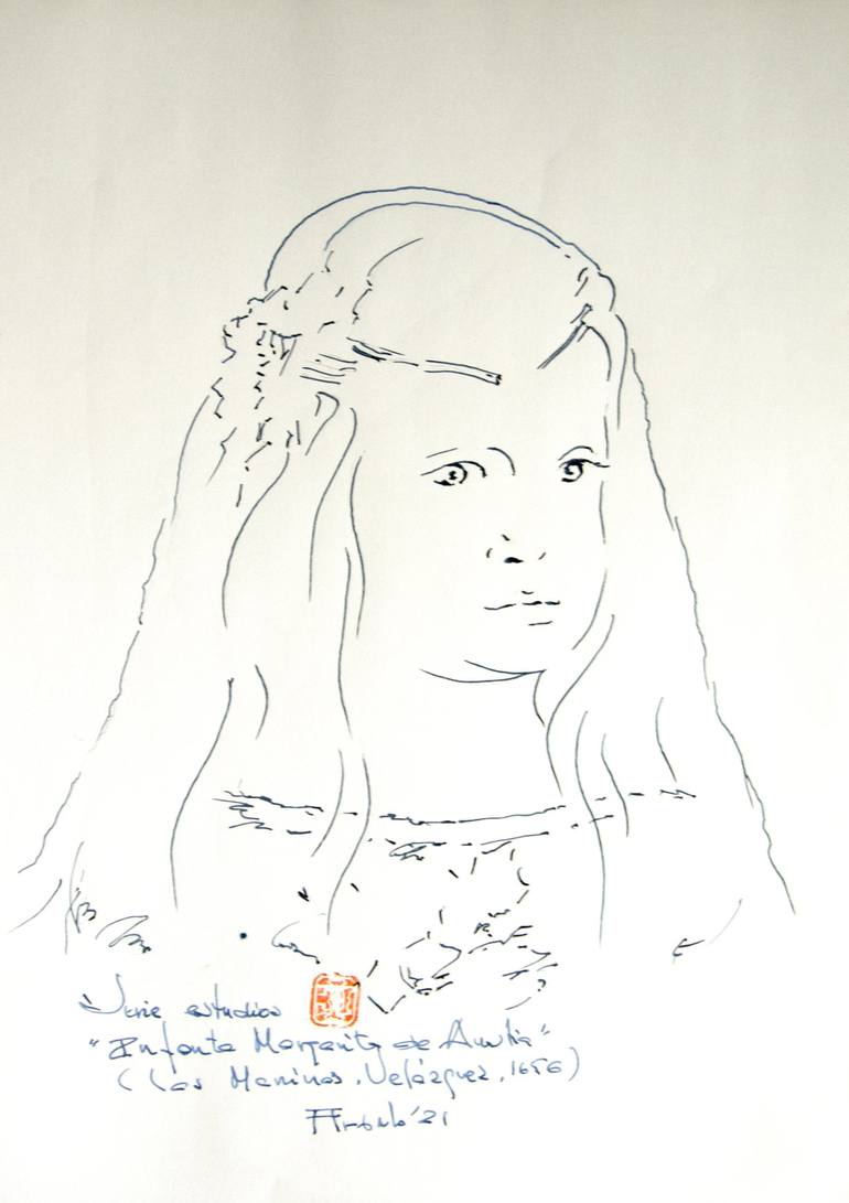 This work is made with pen on paper. It is a line study on a detail of Velázquez's immortal work, "Las Meninas", in the Prado Museum in Madrid. It is an aesthetic translation of Velázquez's fragile delicate and sensitive painting into a line study of the face of the girl Infanta Margarita. My study ...
