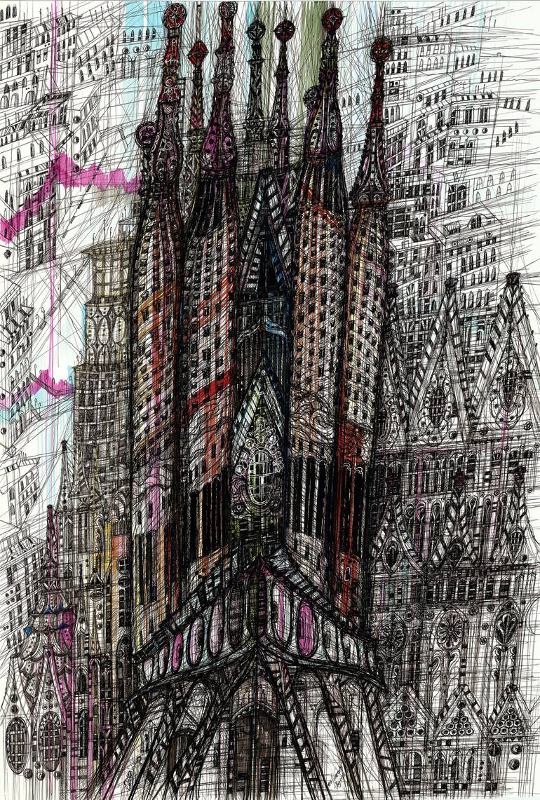 My new mixed-media drawing of amazing Sagrada Familia! I think that this building is phenomenal and very special. It's architectural composition is unique. I created this artwork using graphic tools, markers, liners on a cardboard (finnish cardboard with marble crump). This artwork is framed in a bl...