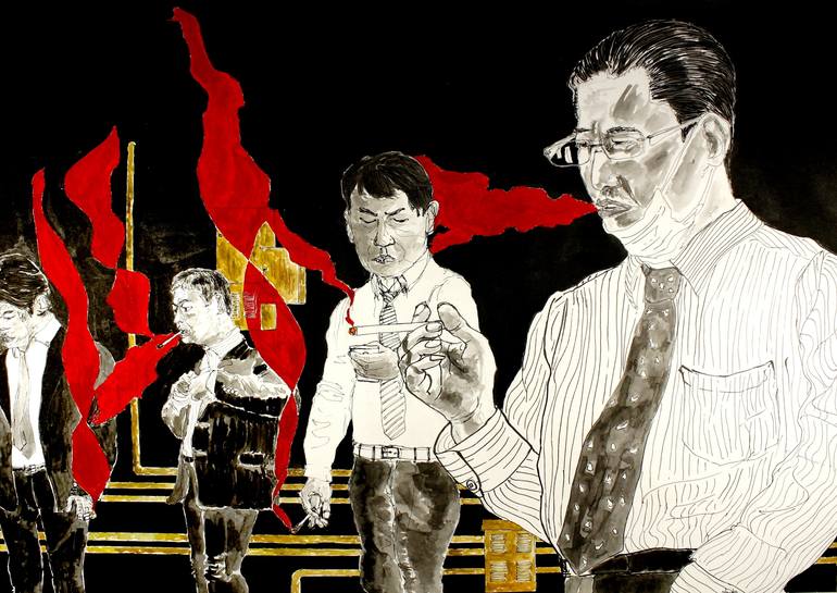 "Kaishain" means "salaryman" in Japanese. It's a very important word in Japanese society. It represents the huge amount of white collars in the many Japanese big companies that have built the wealth of the Nation. Here taking a smoking break with tired an worried face... A Nation dedicated to work.