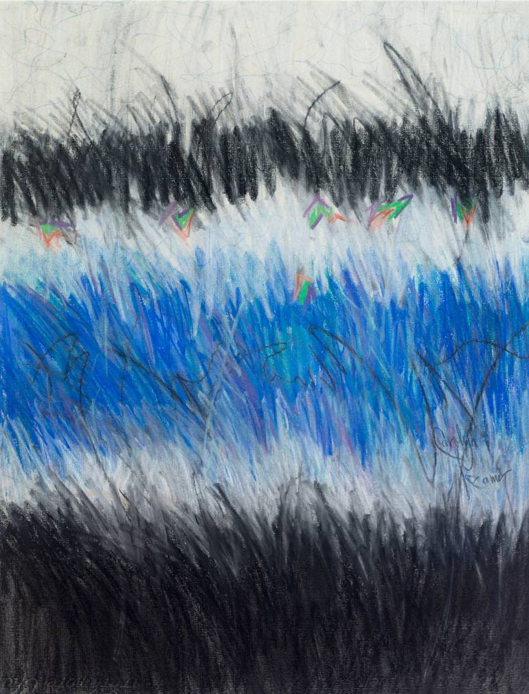 Horizontal lines of the sea inform this pastel paper work. The ocean is captured in colbalt & sapphire chalk pastel woven along with rich blacks, whites and shots of bright orange which occur throughout the art work. Bold gestural scribbles capture the energy of blowing wind and water. The viewer wi...