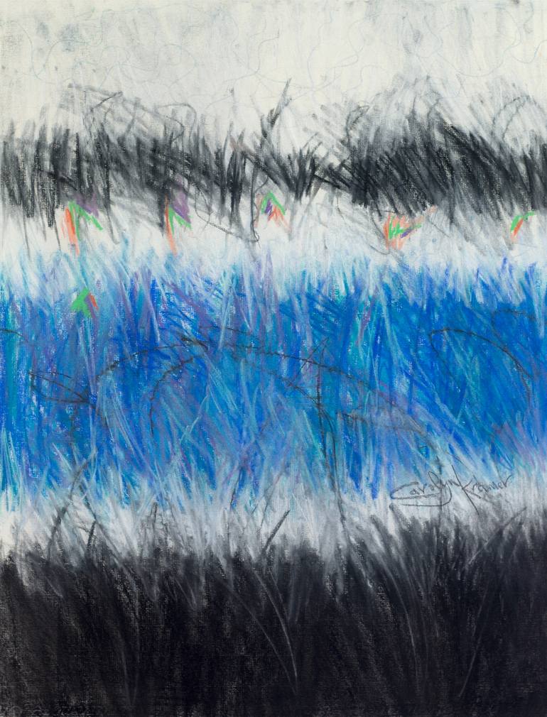 Horizontal lines of the sea inform this pastel paper work. The ocean is captured in colbalt & sapphire chalk pastel woven along with rich blacks, whites and shots of bright orange which occur throughout the art work. Bold gestural scribbles capture the energy of blowing wind and water. The viewer wi...