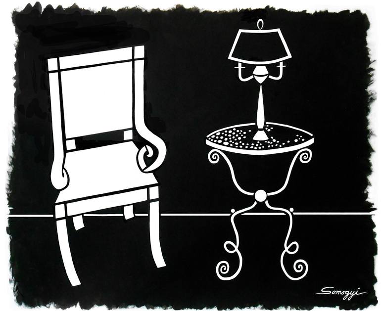 This is an interior scene of a chair and a lamp on a round table, taken directly from the artist’s own bedroom, done in white on a black background. The table was “trash find”. I covered the top in acrylic jewels of all sizes (greens and turquoises in real life) which was then covered with resin. ...