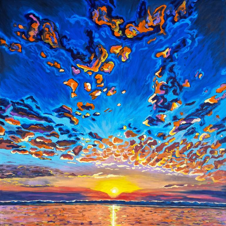 A sunset in this picture is captured in thick , impressionistic brush strokes and lively hues of orange , pink, and blue. This painting recreates the feeling of actually standing by the bay and seeing the sunset in person, in all its wide. "Sea, Sunset And Love" is an original oil painting on stret...