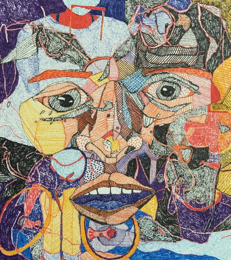 I started this work as a portrait of friend and continued to layer images from my surroundings within the drawing. The figures are all drawn in parts and disrupt the central image of a person's face. I feel like my friend looks like they are halfway there, disassociated, or floating away.