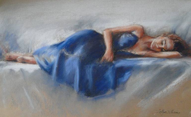 Reclining woman asleep in blue silk negligee. pastel on nutmeg ingres paper