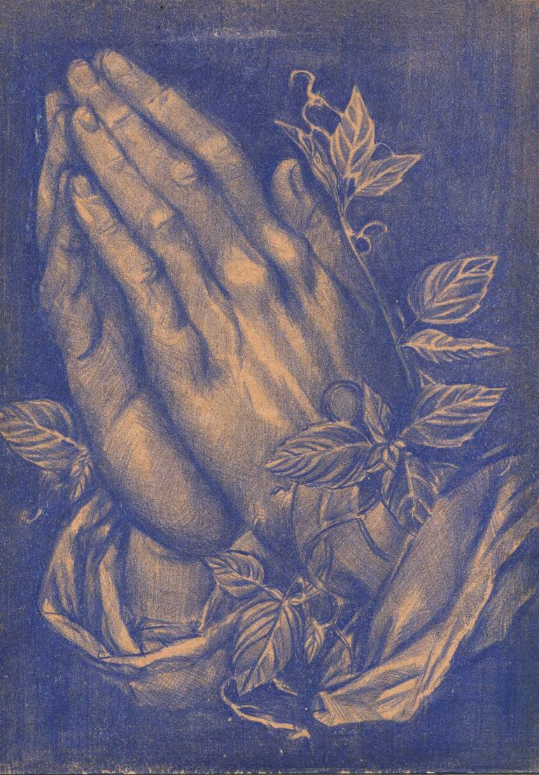 In this piece, hands in prayer are surrounded by lush botanical textures. The hands symbolize a spiritual surrender, expressing a quest directed towards nature or inner peace. The surrounding ivy represents the connections humans have with their roots, the nurturing power of nature, and how the huma...