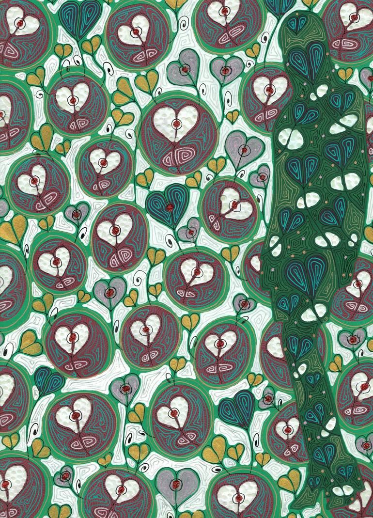 This work is one of the series “Silhouettes”, which shows a woman’s daily routine, meetings, conversations, feelings, dreams, thoughts, and plans. The work is drawn on thick green art paper. The dark red circles and the dark green image of a woman are an application. White, gold, and silver acrylic ...