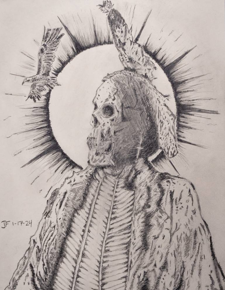 Skeleton with Native American headdress, Eagle in Flight with Halo. Graphite on 199g Ivory Smooth paper.