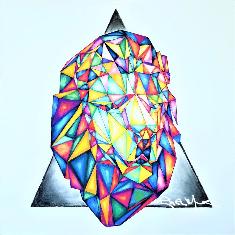 Inspired by the vibrance and beauty of classic stained glass, this piece resembles a lions head conformed of geometric shapes. Vibrant, rich colors.