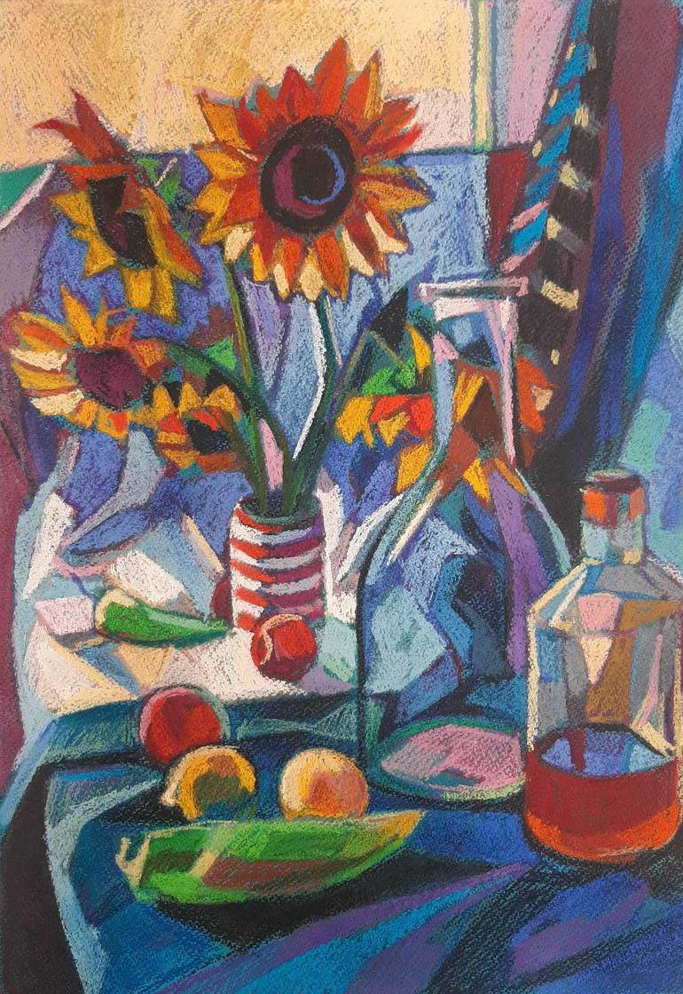 The picture shows still life with sunflowers and fruits. The painting is of intense colors, made in technique of soft pastel on paper