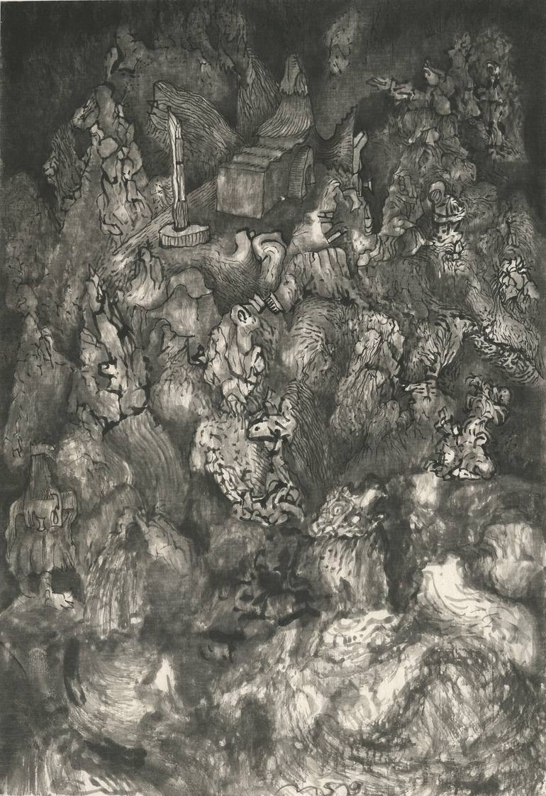 Brushdrawing with Chinese ink on Chinese paper.The drawing is wet mounted on Hahnemühle sumi e paper 160g Drawing size: 35 x 24cm Mounting-paper size:47cm x 36,5cm The mounting-paper can be cut in size of your frame.