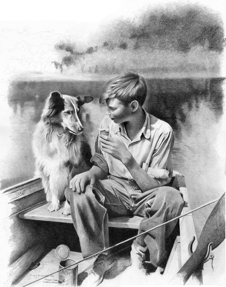 this 14" x 17" graphite pencil drawing comes from a vintage public domain photo, depicting a teenage boy sharing his ice cream with his dog, while fishing.