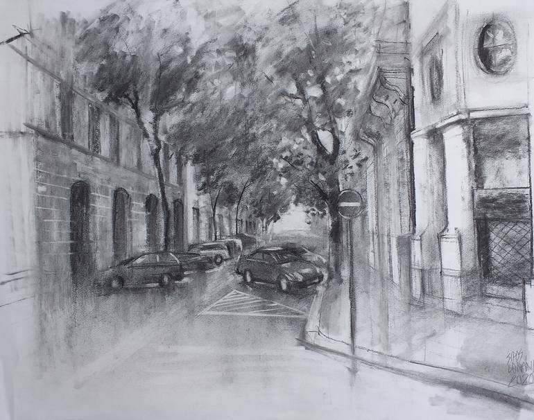 This is an original charcoal drawing about a street with parking cars . Every work is signed and comes with a Certificate of Authenticity and is wrapped carefully for shipment around the world to ensure safe arrival. “What you can not tell with words, I can tell you with my paintings :-)”