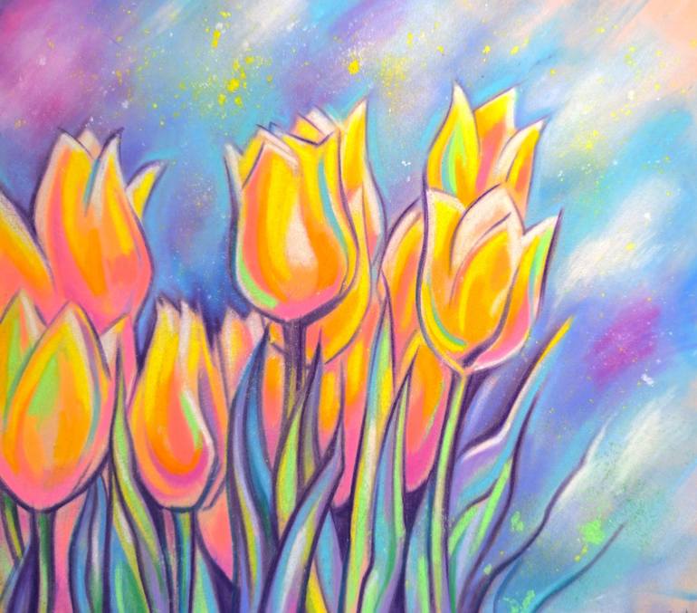 Sunlit Flowers This artwork portrays vibrant, luscious tulips that seem to have grown in the sky. Their petals, painted in delicate shades of yellow and pink, shimmer against a backdrop of pastel clouds. Thin stems, like paintbrushes, stretch toward the soft blue sky, speckled with tiny, sparkling s...