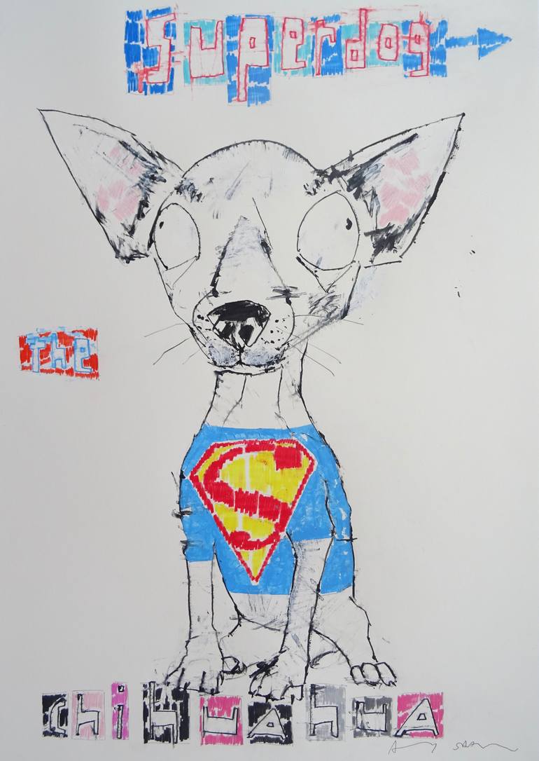 Superdog the Chihuahua Ink, acrylic and pencil on paper 2018 Signed by Andy Shaw Ready for framing