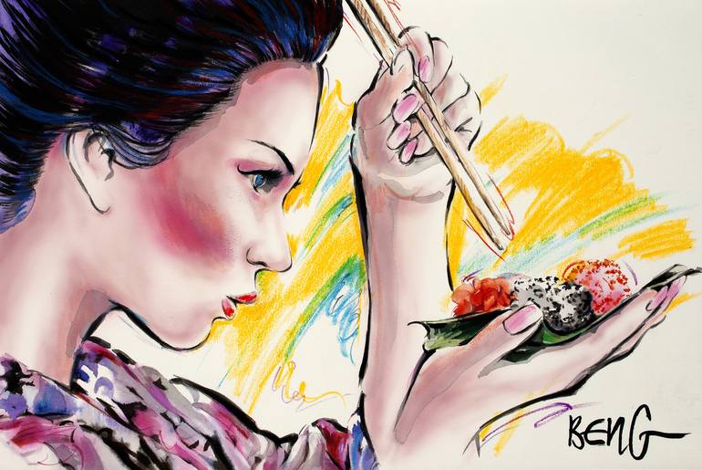 Girl looking to savour those tantalising bites of exotic sushi flavours. Ink, pastel and airbrush on Saunders Waterford 300gsm cotton paper.