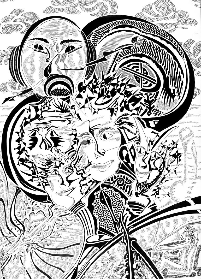 This is ink with pen on paper. It is my abstract that I have make in the beginning of my career. Full with fantasy I use a lot experiments at this time with a lot of lines, small circles and points on the paper to have the shadows I want.