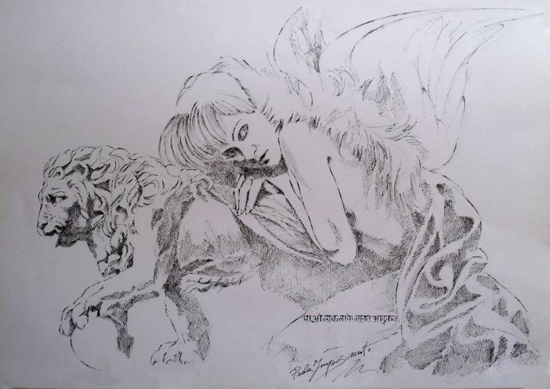 Drawing made in ink and pencil on cardboard inspired by the imaginary vision of a ghost wandering in the Loggia dei Lanzi, Florence's historical monument located in Piazza della Signoria. Above one of the two marble lions placed at the sides of the entrance steps, symbols of guard and protection of ...