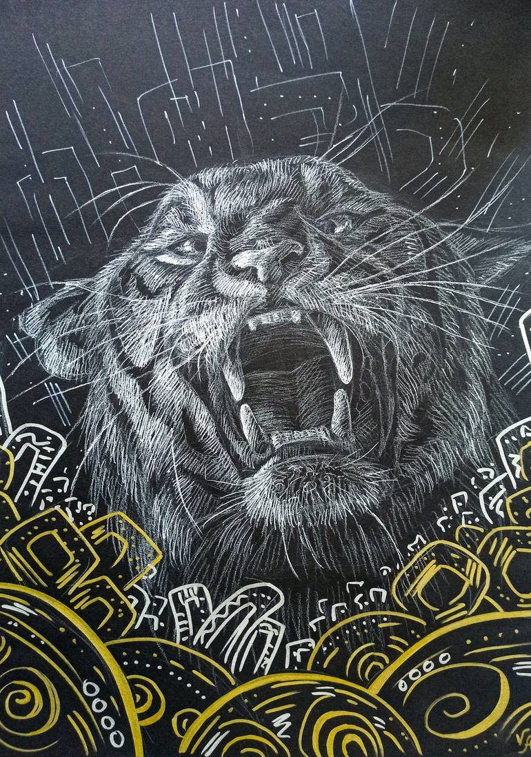 I like to draw lions or tigers in a rage. Such paintings have a special energy and evoke a whole range of new emotions. In this picture, I tried to convey all the strength and power of the tiger Mix media painting, Paper One of a kind artwork Size: 41,8 × 29,5 × 0,1 cm (unframed) This artwork is s...
