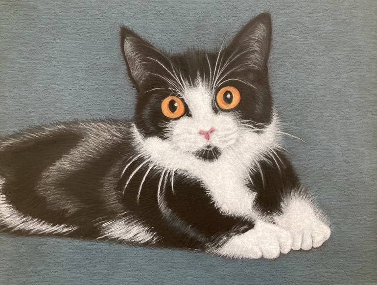 "TUXEDO CAT" is a charming drawing inspired by the simple beauty of black and white cats, particularly those with a furry white chest, round white cheeks, and Snow White paws – the cats who look as if they're wearing a tuxedo! This delightful animal portrait is created using colored pencil on paper...