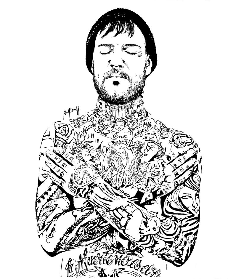 TATTOO MAN's painting on watercolor paper with the use of Indian Ink, Black pen and markers.