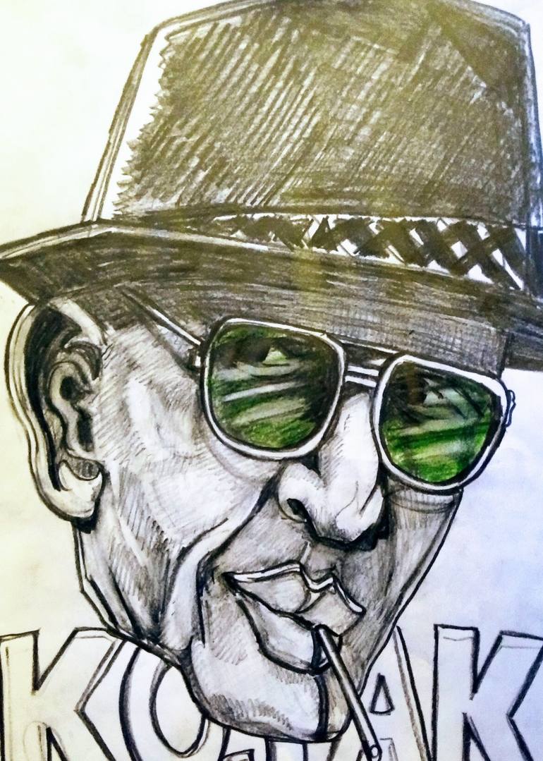 Pure pencil drawing of Kojak, using green pen for the sunglasses