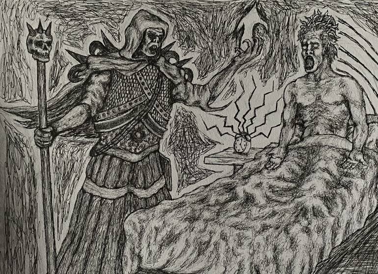 I was inspired for this piece by my experiences with waking up most days. I've realised that I'm definitely not a morning person, and this work is what I thought of when brainstorming the most extreme imagery for the subject. It shows a necromancer (someone who resurrects the dead) waking up someone...