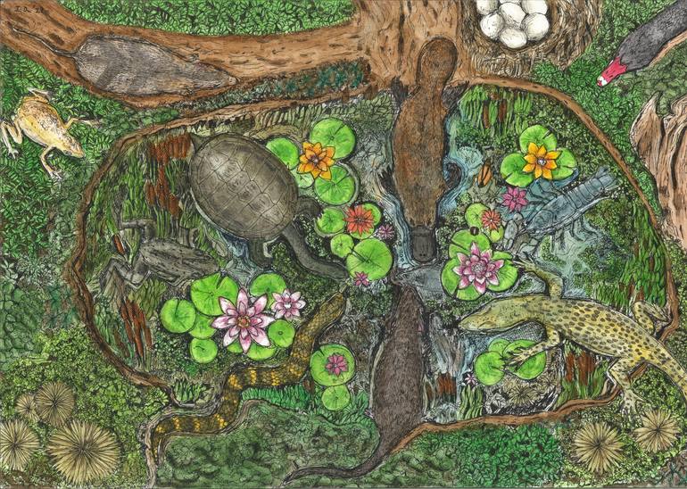 Australia's wetlands provide an endless source of inspiration to me, so this is my stylised/realistic homage to that, conceived as a top-down view of various Australian native fauna and flora converging in a small waterhole/billabong. I usually work in ink and watercolour, so thought it would be a s...