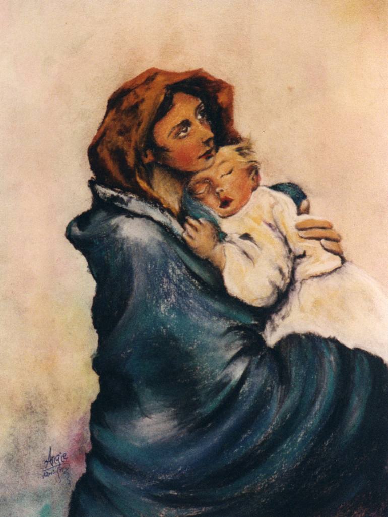 Mixed media: colored ink and pastel drawing after Roberto Ferruzi´s ¨Madonnina¨. Drawing copied from a church boletin, while enduring a boring Sunday sermon. Years later I found out after reading the amazing story behind Ferruzi´s piece, that the eleven year old model´s name was Angelina, my name!