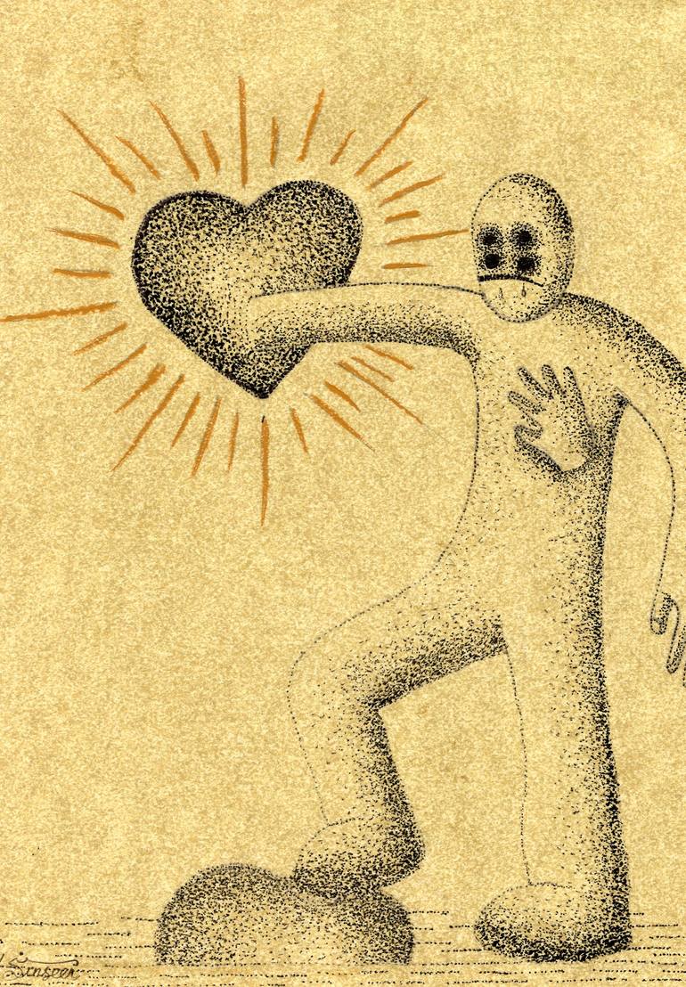 The figure is shown with one arm extended, reaching into a large, radiant heart. The figure's hand is immersed within the heart as if becoming one with it, while the other hand is not on his chest but coming out of it as if it is along the big heart., conveying a sense of connection, vulnerability, ...