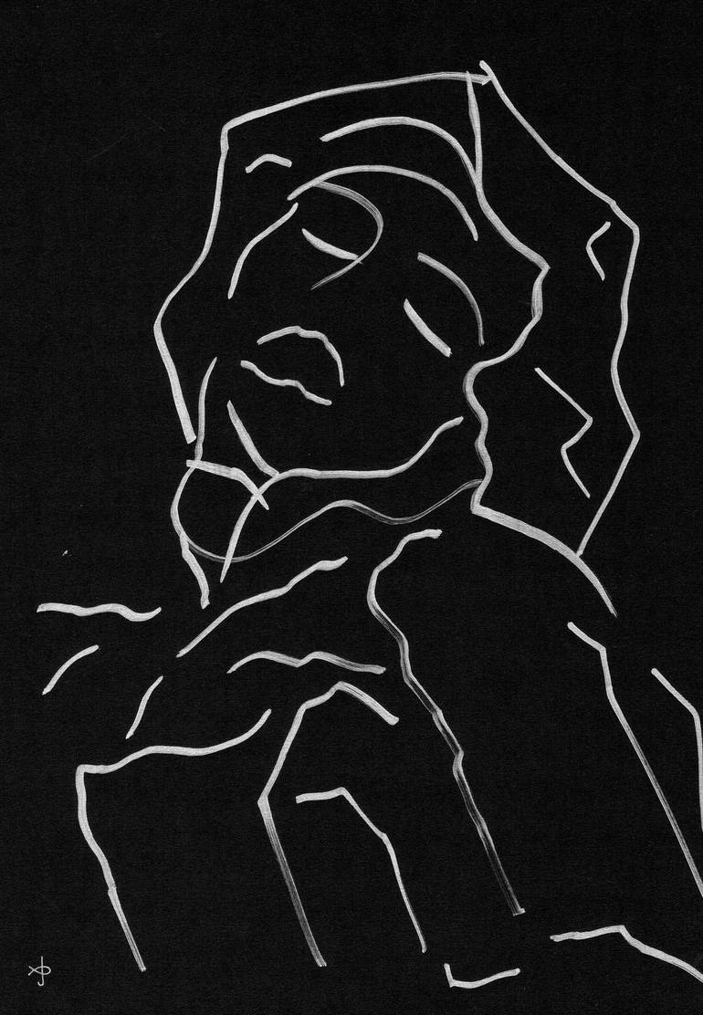 A minimal line drawing of part of the famous sculpture by Bernini. St. Teresa's autobiography relates her spiritual ecstasy - dramatically shown in the sculpture. Iridescent silver acrylic pen on black cartridge paper. Stunning as a large print on canvas/acrylic/metal