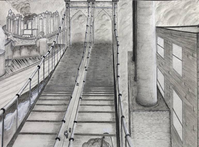 This charcoal, graphite, and ink drawing portrays aspects of Manhattan including the ferry, North Port Power Station, the Brooklyn Bridge, and a representation of 9/11. The stifling conglomeration of transportation, power, pollution, and terror show the various ways that humans are destroying their...
