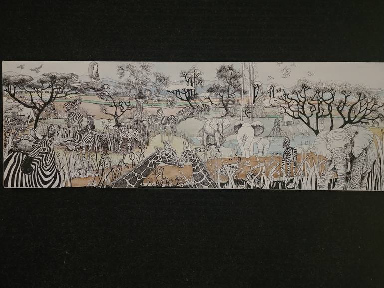 NOTE: The black border above and below the image is NOT part of the painting. It is just the background for taking the photo of image. Pen & Ink drawing is a wonderful method to express details and illusion. The stripes and spotted patterns on African animals are fun and intriguing. Their varie...