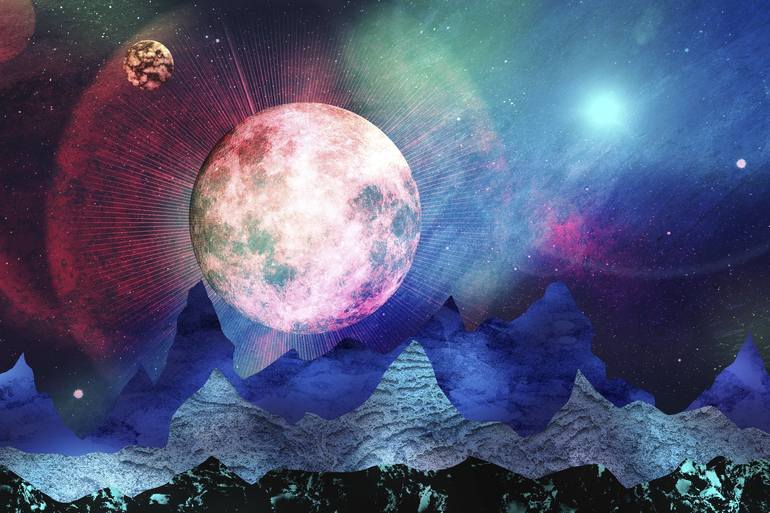 Fantasy illustration of a colorful moonlight and planet mountains.