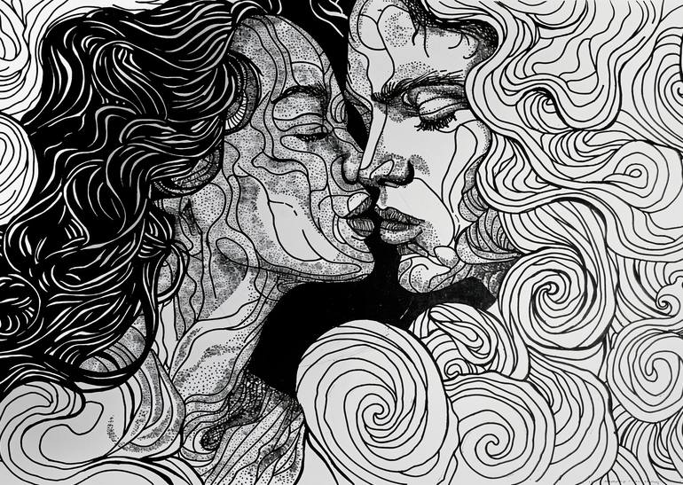 "The Kiss" is an evocative ink illustration that delves into the profound intimacy shared between two individuals. The artwork portrays a tender kiss between two faces, each intricately detailed with swirling lines and patterns that converge and flow into one another. The figures are crafted using a...
