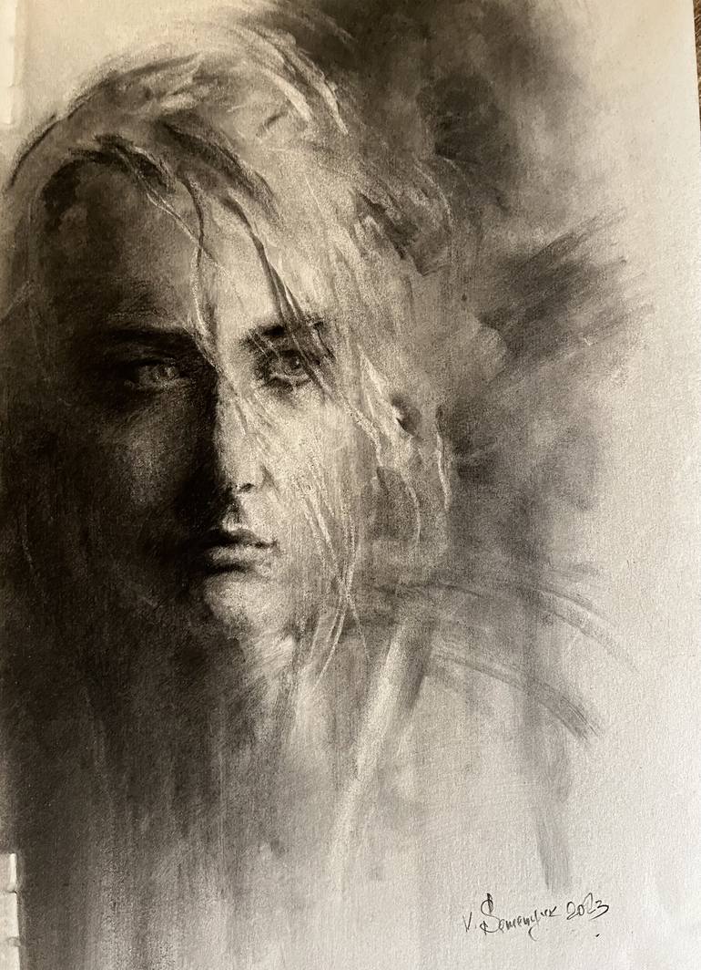 The picture was drawing from life with expression style. Charcoal on paper A3 size. Signed. Ships in a box( modern frame -optional)