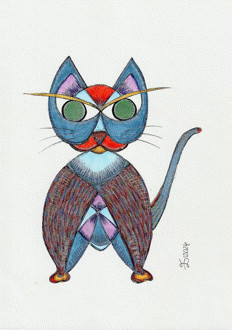 "Tomcat Tomo" is an original fine art drawing from Ewa Dura’s "Fantastic Creatures" series. This charming, expressive piece was created using markers and ballpoint pen on quality 300 g/m2 paper. The white background enhances the vibrant colors and delicate metallic effects, bringing a touch of joy t...