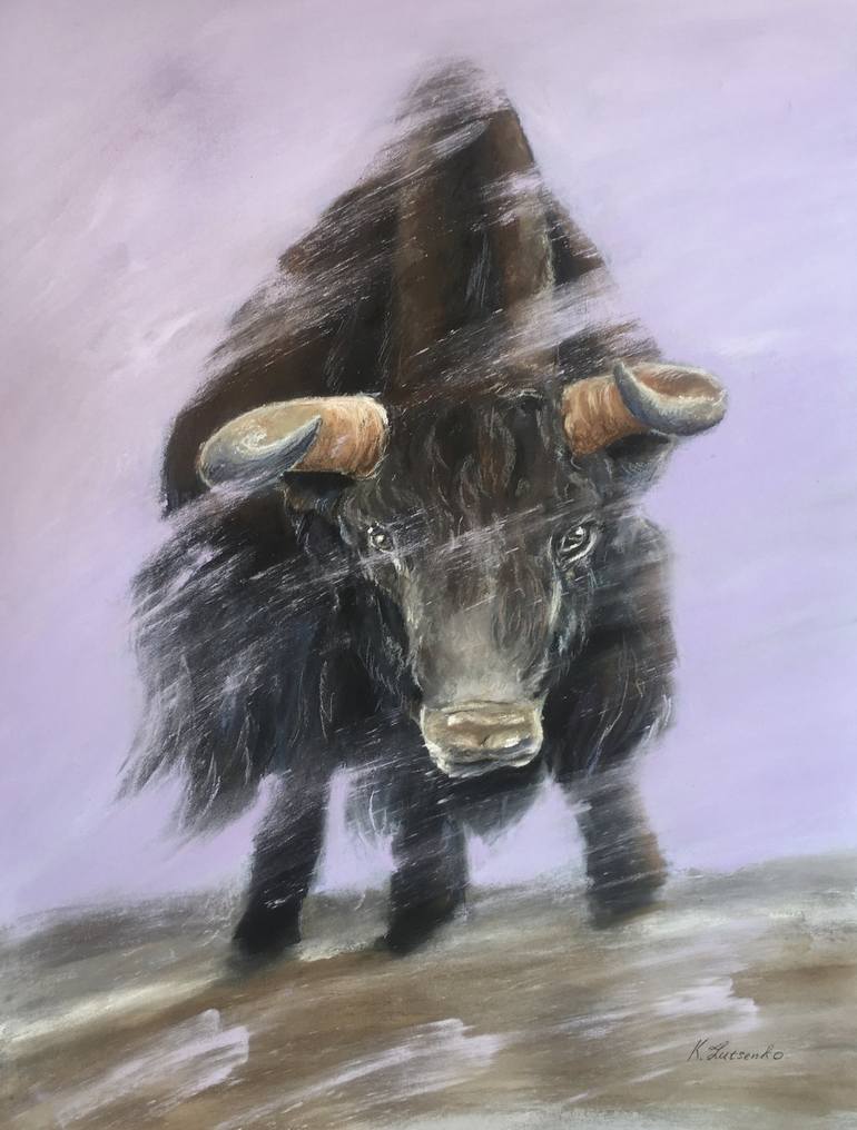 Experience the raw beauty and resilience of nature with "Tough Life," a powerful pastel artwork by Spanish artist Ksenia Lutsenko. This evocative piece portrays a wild yak braving the fury of a winter blizzard, a striking depiction of survival in the harshest conditions. The artist's bold and gestur...