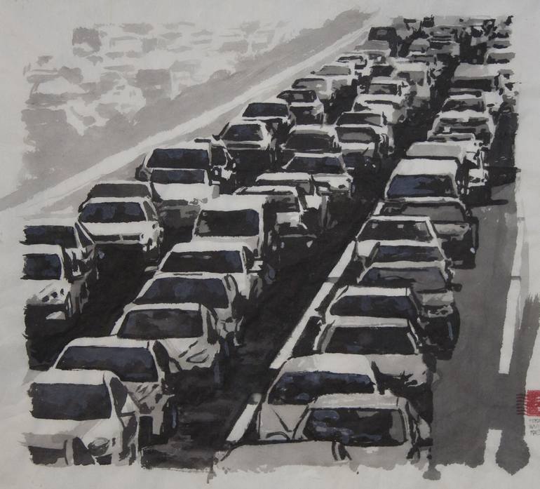 As with all my ink paintings, this piece is an amalgam of Eastern and Western aesthetic. Is it twisted to love the look of traffic?