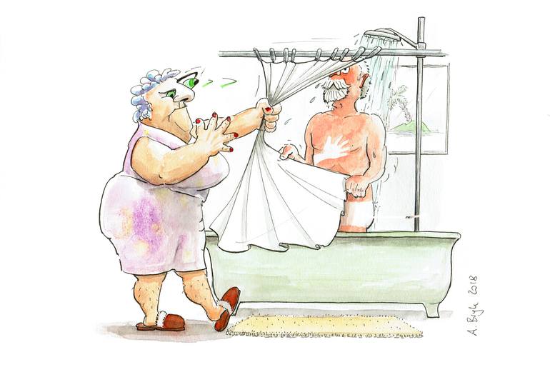 This ink and watercolour drawing is part of a mini series of two to enter in a cartoon contest. The subject, "travel memories", can of course be interpreted very widely. Getting sunburnt in the wrong place is not unlike an incriminatory photograph. Better plan carefully when to have a shower in case...