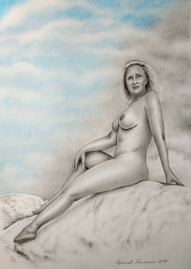 The main idea of the painting is the natural beauty of the female body, the embodiment of gentleness, tenderness heroine. The women - a mystery of nature, symbol of creation and harmony. Perfection and sensuality I find it in a woman. This charcoal work is no framed. A standard A2 (60x42.5cm) frame...