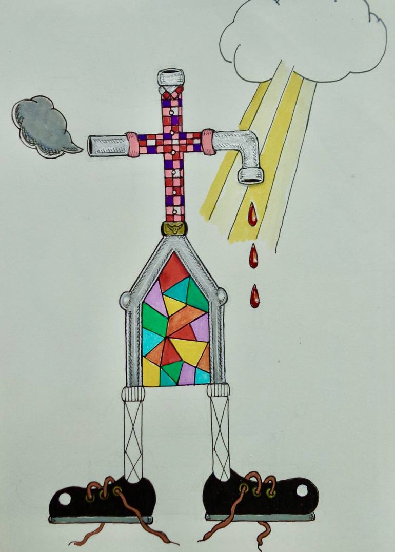 This piece was inspired by the notion of "organized religion " .However, in this case various concepts and images were combined and arranged in a composition that has t's own twisted logic without a set direction.