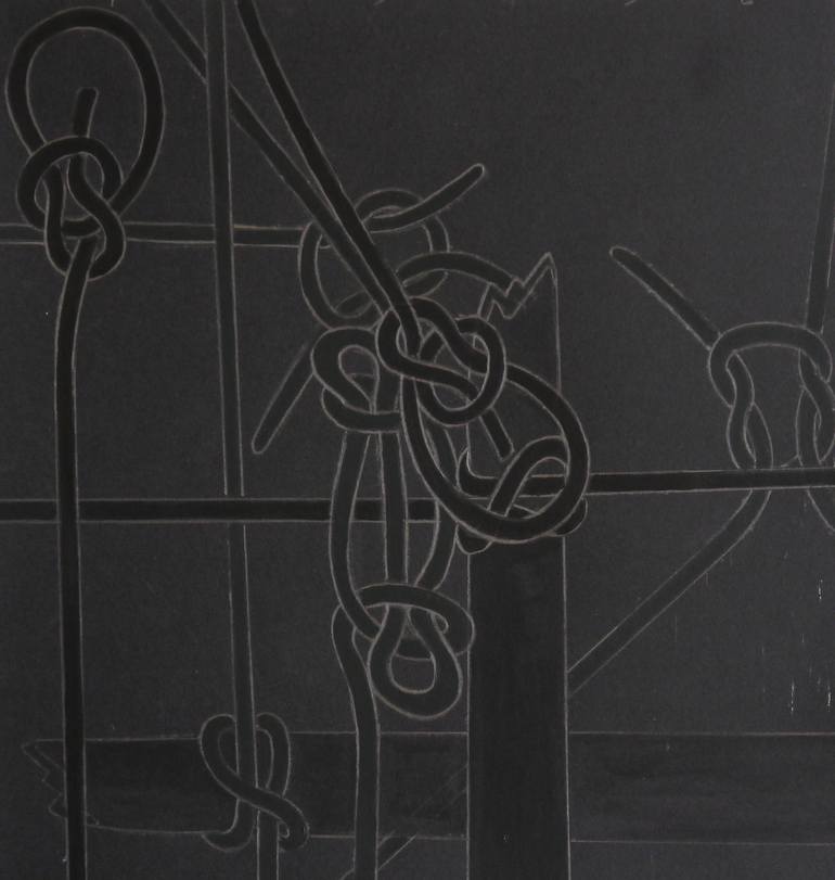 This drawing was the second quick study of new black on black Knots Drawing. It is an exercise in composition. As usual I employ a chance operation way of working - I roll dice to determine which knots and where they are located upon the black limbo background.